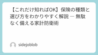 節約 【これだけ知ればOK】保険の種類と選び方をわかりやすく解説 ― 無駄なく備える家計防衛術 保険は「入って安心」より「必要なものだけ選ぶ」が正解。この記事では、生命保険・医療保険・損害保険の違いや特徴、加入の判断基準を初心者向けにわかりやすく解説。無駄な保険料を減らすヒントも紹介します。 2025.11.01 節約